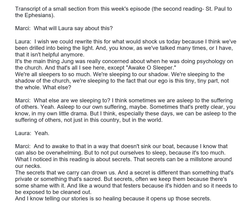 I’m thrilled with this new podcast project. My history with the Catholic church is a central part of my individuation journey. I felt a calling to create this new art-work , especially when the brilliant and talented Marci Madary agreed to join me in the local sound booth. While we both do some preparation for our conversations on the Sunday’s scripture readings, neither of use know what we will say, and we both have no memory of what we’ve said! We are clearly “inspired by the Holy Spirit” (Marci) or “allowing the Unconscious to speak” (me).